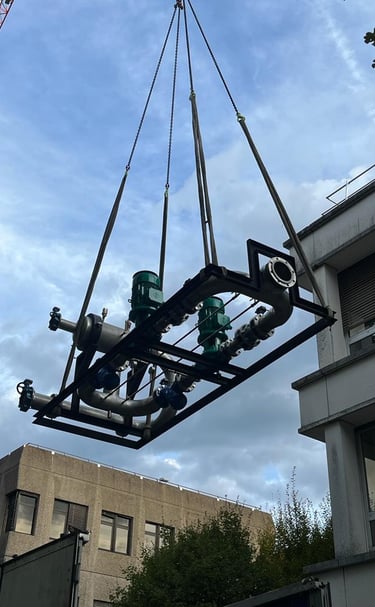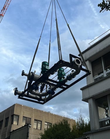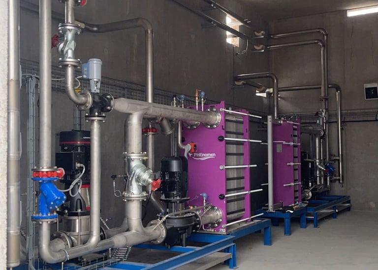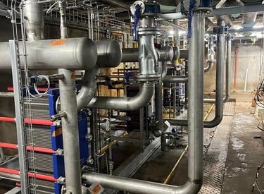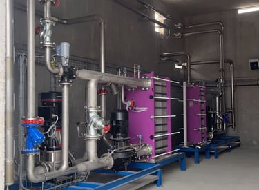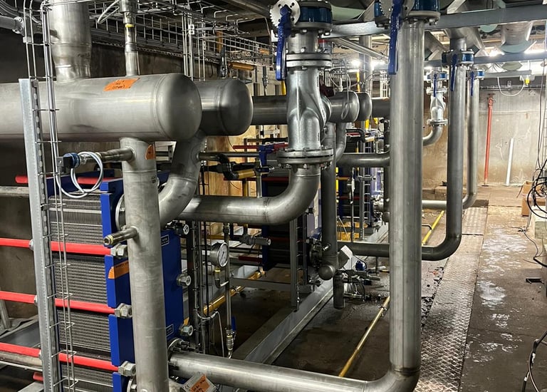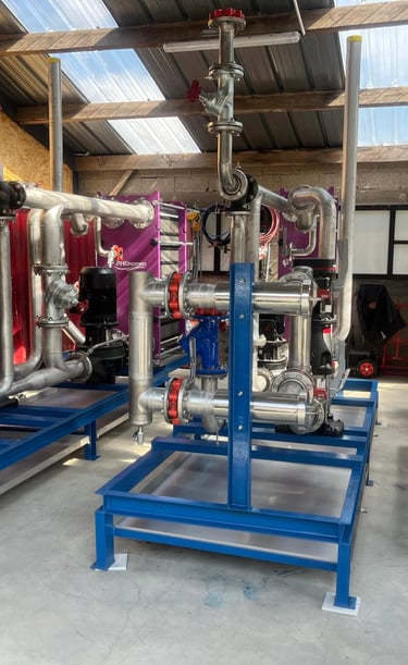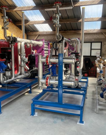 Préfabrication des châssis et de la tuyauterie dans notre atelier et raccordement sur site des deux skids échangeurs à plaque ainsi que la distribution en collecteur. Sodebo, Montaigu
