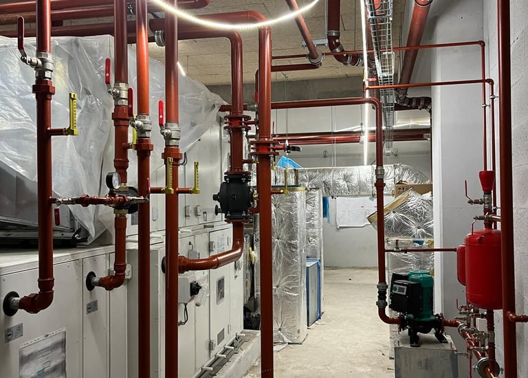Raccordement hydraulique de 6 centrales de traitement d’air dont 5 avec des batteries de récupération sur le projet du centre chirurgical de pontchaillou.